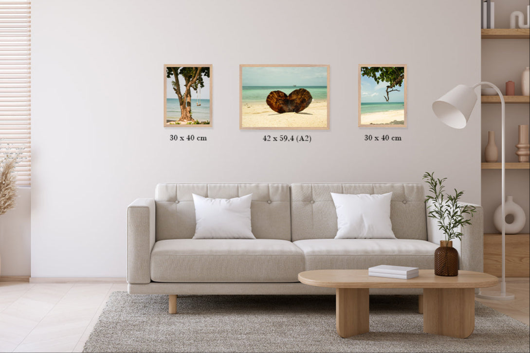 Fyll veggen med varmen fra stranden, og drøm deg til late dager med ro i sinnet og sol i fjeset. Stående bilder er 30x40 cm og det liggende er a2 (42x59 cm).